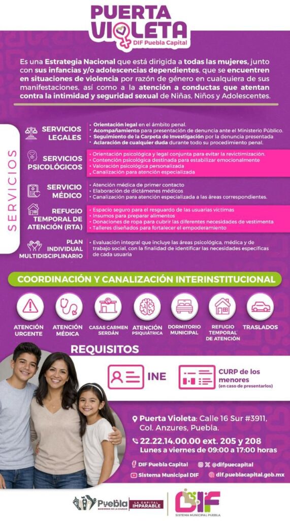 Con el objetivo de fortalecer la atención a mujeres víctimas de violencia en Puebla capital, el DIF Puebla Capital, encabezado por la presidenta del Patronato MariElise Budib, reforzó el programa Puerta Violeta, una estrategia integral que brinda acompañamiento y protección a mujeres, niñas, niños y adolescentes que enfrentan situaciones de violencia.